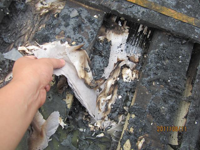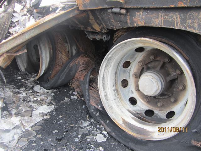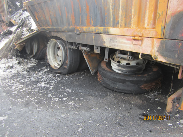 中国物流联合运输协会 物流企业国内公路货物运输保险条款 真实理赔“案例第21起” 被保险单位:山东省烟台市 李俊 被保险人:李俊 出险时间:2011年8月11日; 出险地点:山东金山高速; 出险原因:轮胎突然自燃,导致车上货物80%烧毁; 现场照片